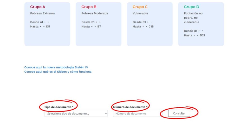 - Grupo D (D1–D21): población no pobre ni vulnerable, generalmente sin acceso a subsidios.
